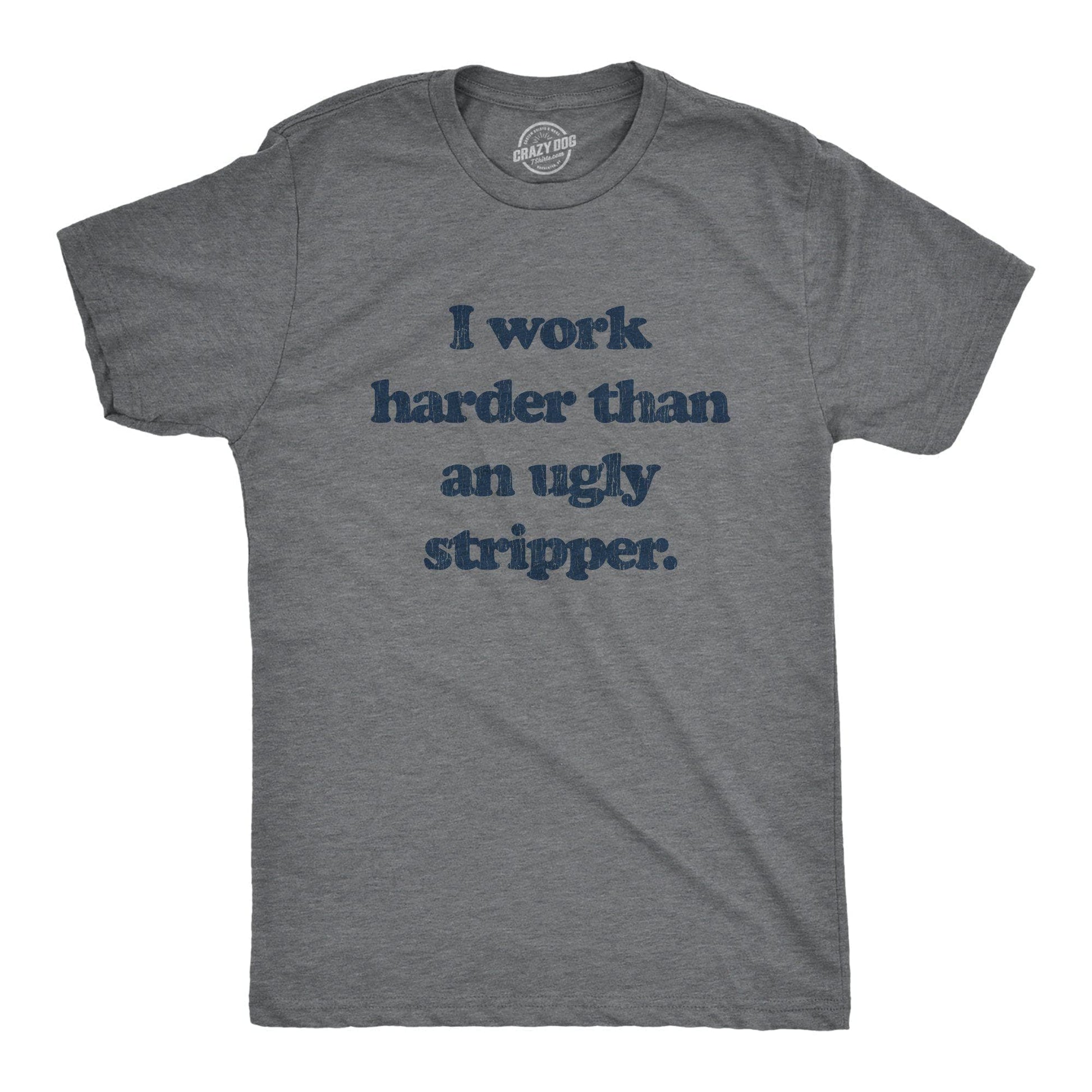 Show off your sense of humor with this playful "I Work Harder Than An Ugly Stripper" men's t-shirt in dark heather grey. Crafted for comfort and style, it’s perfect for those who like to keep things lighthearted while making a bold statement. Whether at work or out with friends, this tee adds a fun twist to your casual wardrobe.